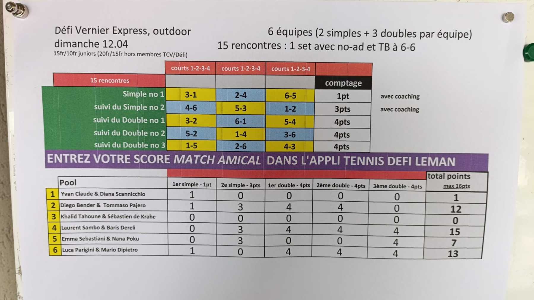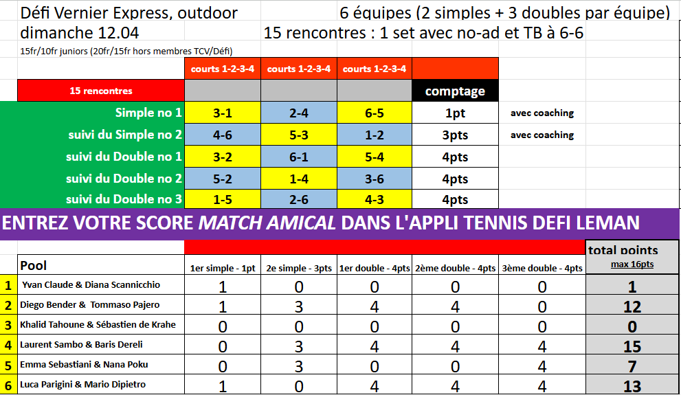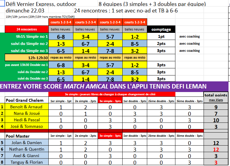 Priorités aux membres du TC Vernier et aux joueur-euse-s du Défi annuel.