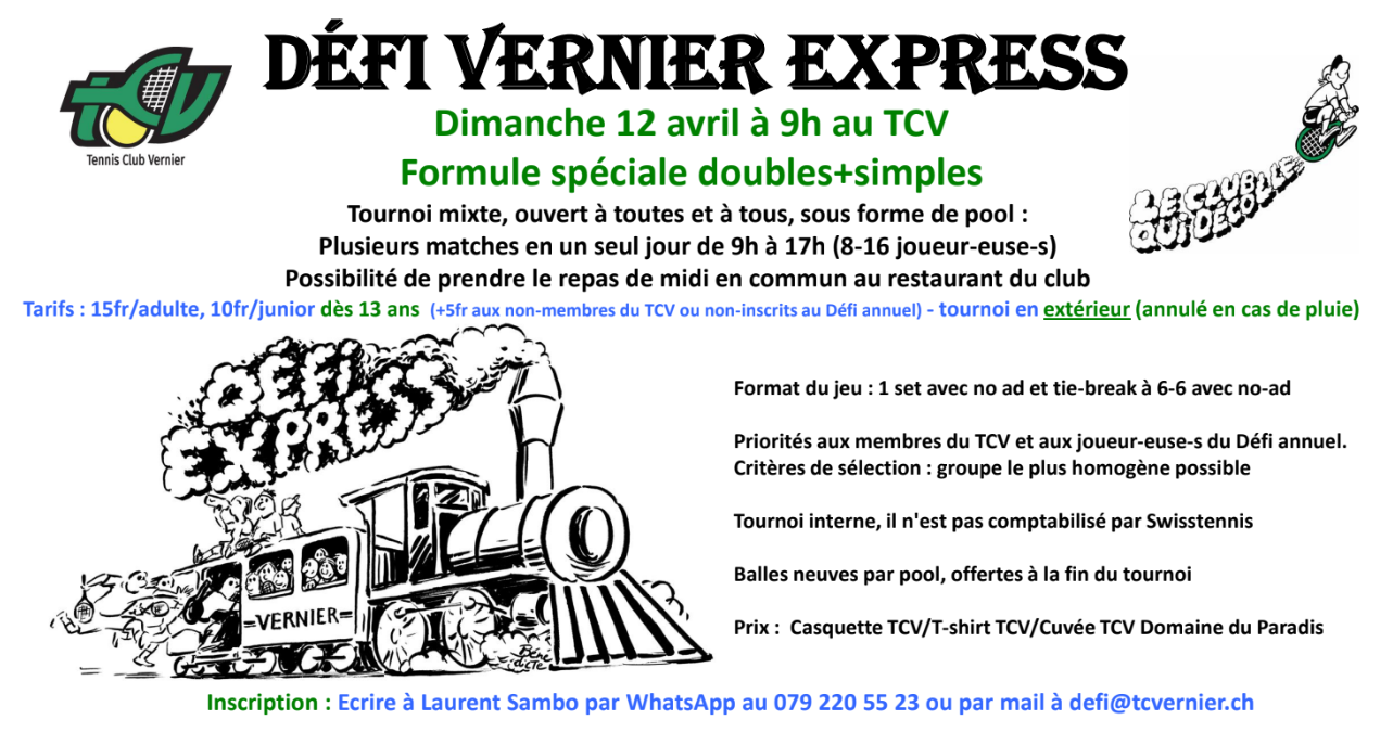 Le Défi Vernier Express est un tournoi simple et double, ouvert à toutes et à tous, sous forme de pool : 3-6 matches en un seul jour de 9h à 17h (8-16 joueur-euse-s), possibilité de prendre le repas de midi en commun au restaurant du club (à vos frais).